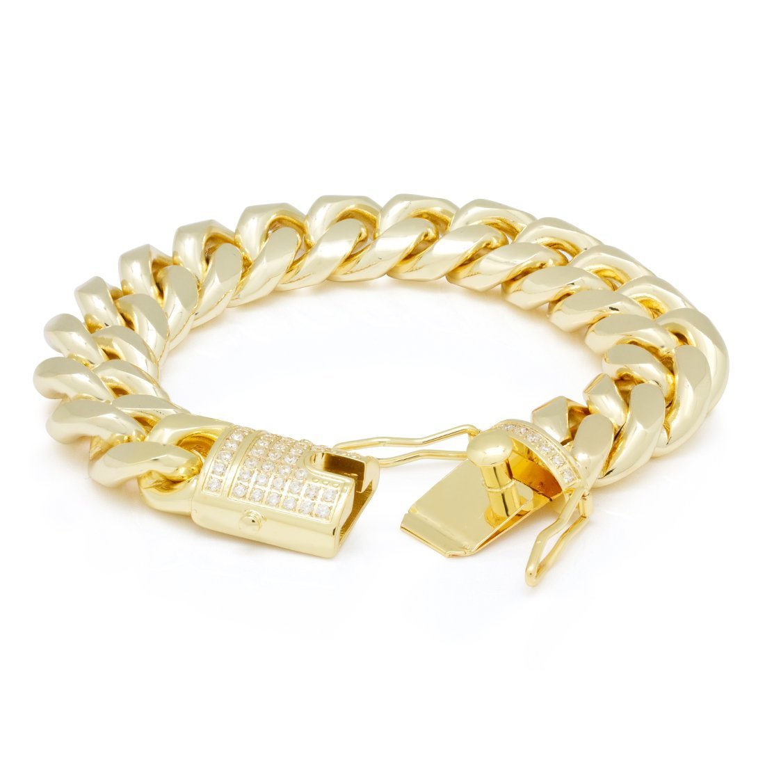 The classic 16mm Miami Cuban chain bracelet now features a new iced out clasp that's covered in VVS Diamond Simulates. The bracelet has a double safety butterfly clasp for a secure and comfortable wear. The bracelet is available in 14K Gold plating and white gold plating. Each bracelet measures 8".