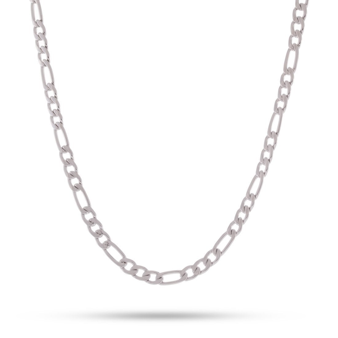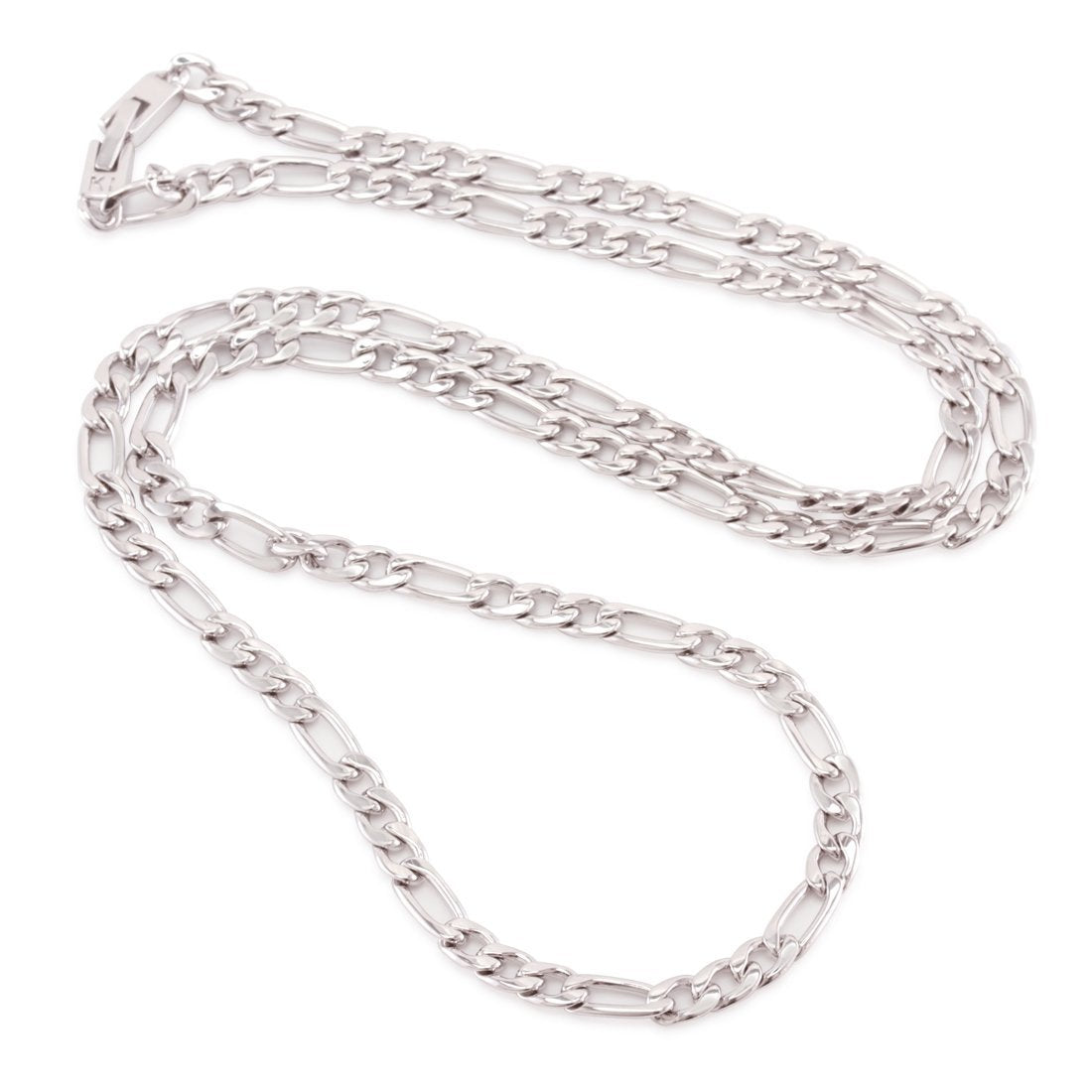 Made from solid stainless steel and plated over white gold, the 5mm, Stainless Steel Figaro chain provides a timeless piece ideal by itself or with another pendant.