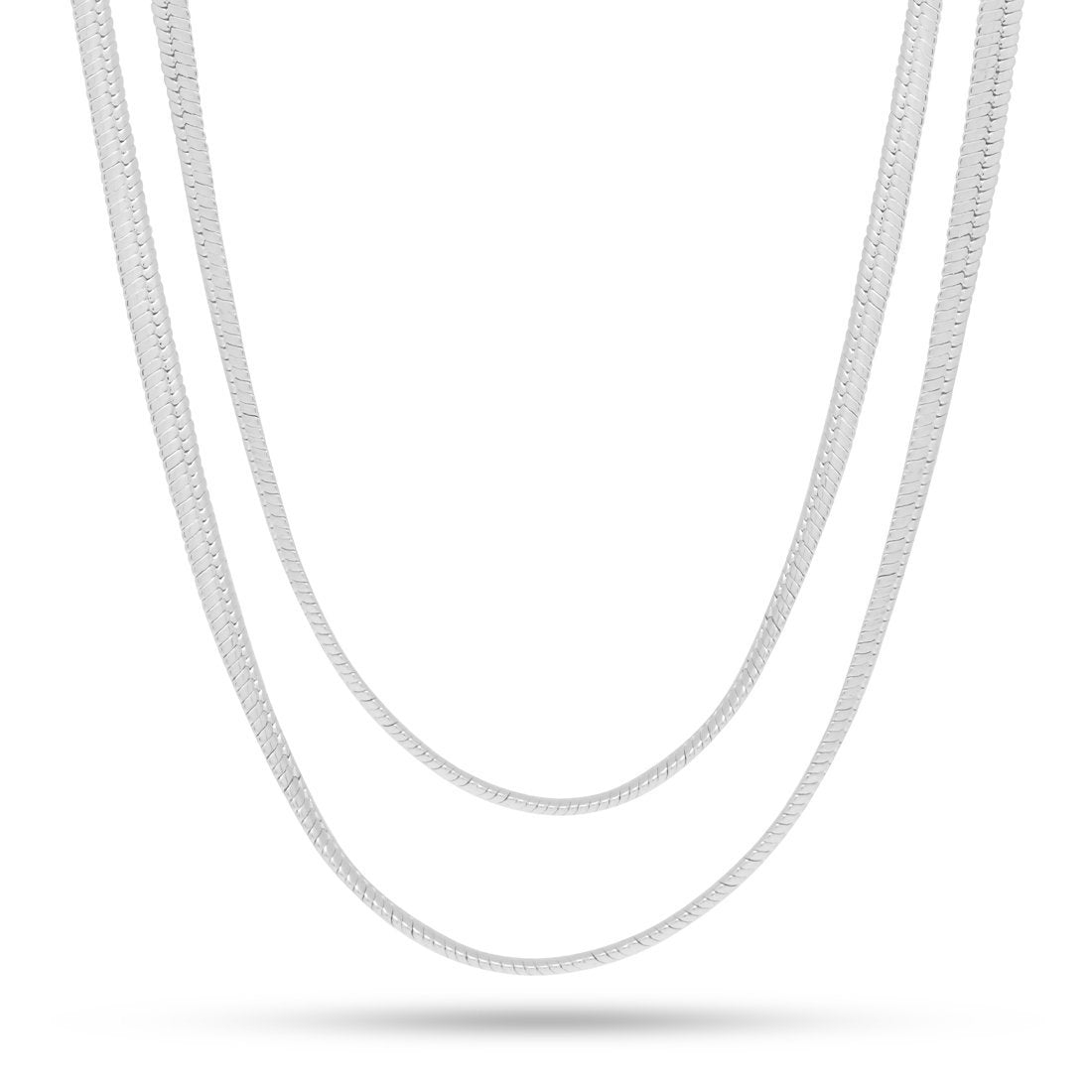King Ice presents the 5mm White Gold Thick Herringbone Choker Set. Each set includes a thick 18" and 20" herringbone choker that comes with a box clasp for a secure wear. The chokers have a flat look because of the intertwining links they have.