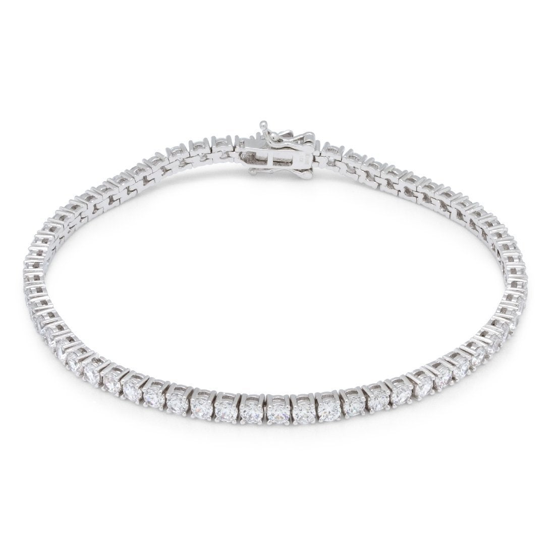 Molded after iconic tennis charms comes our Single Row Tennis Bracelet. The bracelet is iced with white handset VVS Diamond Simulate stones, and each bracelet provides an iconic look available plated in 14K Gold or White Gold.